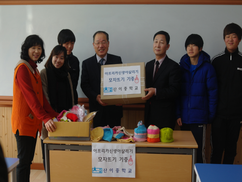 이날 행사는 산이중학교 교사와 학생 99명이 그동안 한울한울 직접 뜨개질한 털모자 200개를 NGO단체를 통해 아프리카 어린이들에게 전달하는 방식으로 이뤄졌다.