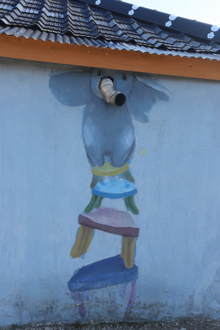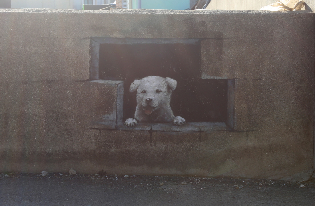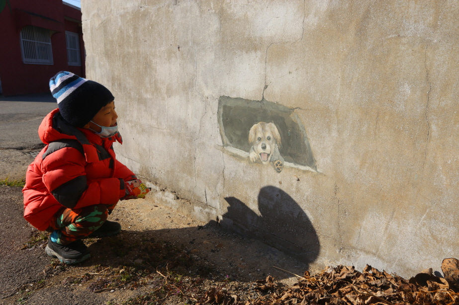 네모반듯한 청년회관에는 깔끔한 꽃한송이. 처마가 모이는 곳에는 제비집이 있고, 공공장소에는 초창기 영화포스터가 눈에 뛴다. 마을 어른들을 위한 70년대 인기작부터 요즘 아이들의 영웅인 아이언맨까지 종류도 다양하다. 마을 정류장에선 항상 혀를 내밀고 있는 정겨운 강아지도 만나 볼 수 있고, 담벼락 구멍 아래선 고개를 내빈 강아지는 언뜻 실물 같기도 하다. 차로 스치듯 지나가긴 아까운 풍경이다. 천천히 마을을 거닐면 보물처럼 만나게 되는 동화 같은 그림들이 자꾸 발걸음을 멈추게 한다.