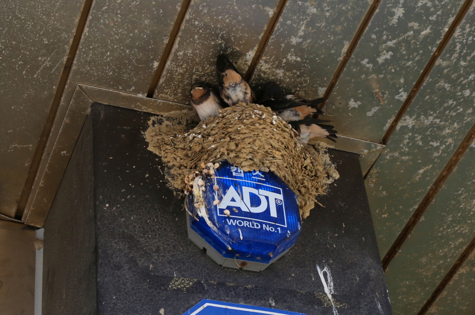 옥천농협 북일지점 하나로마트 처마 밑 제비집에 새끼 5마리가 자리 잡고 있다. 사이렌이 울리는 경비업체 간판에 세를 놓은 제비들은 “짹짹”거리며 농협을 지키고 있다.