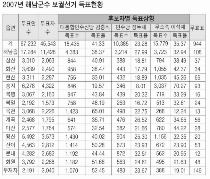 그리고 해남읍과 삼산과 계곡면에서는 근소한 차로 김충식 전 군수에게 뒤졌다.