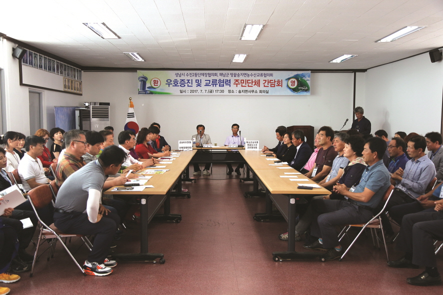 지난 7일 열린 간담회에는 성남시 수진2동 단체장협의회원(회장 김원선) 33명과 송지 땅끝농수산교류협력 회원 20명, 관계공무원 7명 등 60여명이 참석했다.