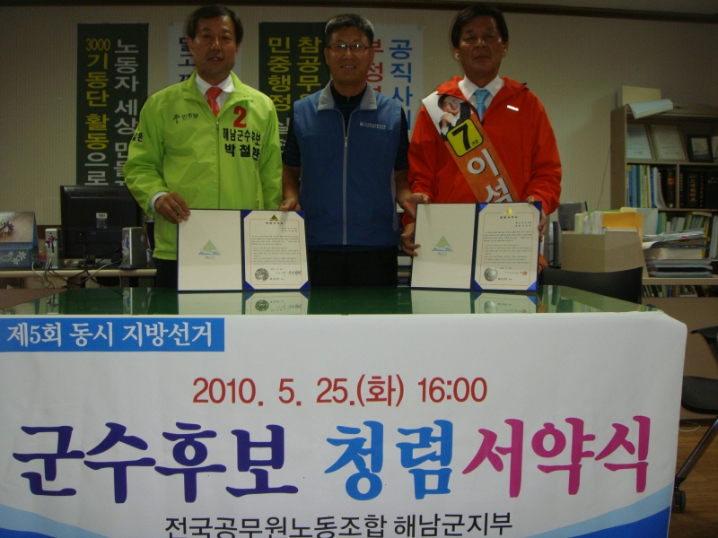 이날 두 후보는 금권선거가 아닌 깨끗한 선거, 비방 비난이 아닌 정책과 비전으로 해남의 미래를 만들어가는 선거를 치룰 것을 해남군민 앞에 서약했다.