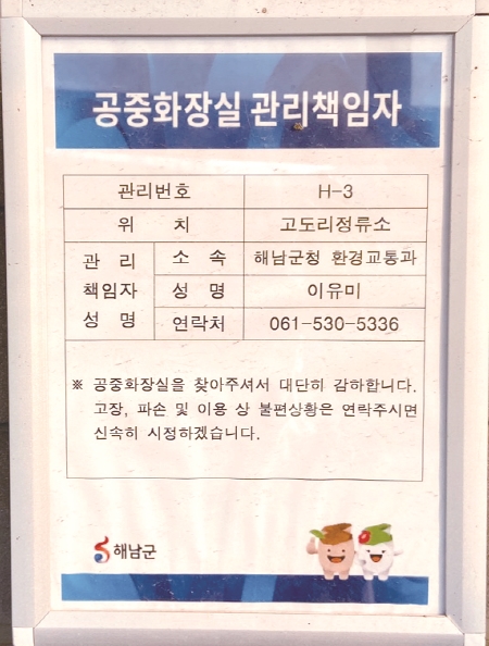 한편 해남공중화장실이 깨끗한 이유는 실명제로 관리하기 때문이다. 해남군은 2017년부터 모든 공중화장실에 관리번호를 부여, 관리책임자와 전화번호 등이 부착된 실명제 표지판을 부착하고 있다.