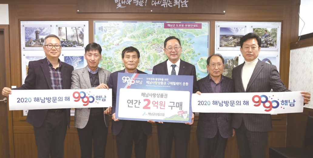 해남군이 지난해에 이어 올해도 해남사랑상품권 구매릴레이를 추진하고 있는 가운데 지난 21일 해남군산립조합(조합장 박삼영)이 연간 2억원의 상품권 구입의사를 밝혔다. 해남사랑상품권 구매 릴레이 운동 참여는 경제산업과 소상공인팀(530-5352)으로 하면 된다.