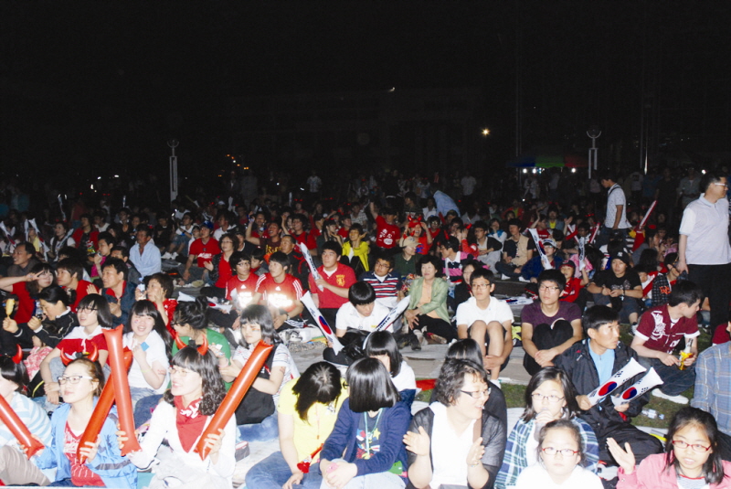 전반 7분 이정수 선수의 첫 골이 들어가자 군민광장은 그야말로 흥분의 도가니 속으로 빠져들었다. 시종 그리스를 힘차게 밀어붙이는 태극전사들의 기운에 이입돼 손을 불끈 쥔 응원단은 골이 터질 듯 터지지 않는 경기를 보며 안타까워했다.
