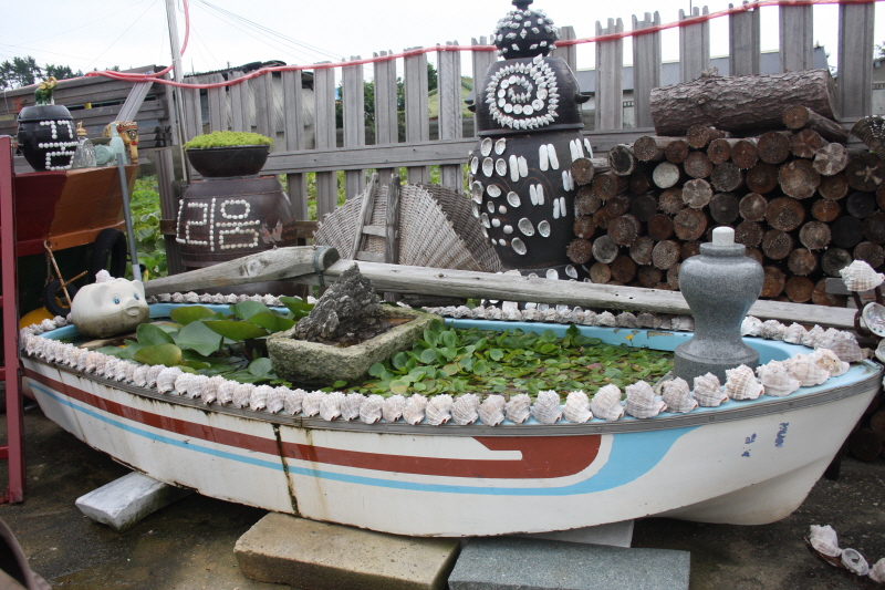 그 많은 갖가지 항아리를 어디서 모았는지, 주인은 항아리를 그냥 놔두질 않는다. 항아리와 항아리를 서로 맞대 쌓고 항아리 외벽을 소라와 조개껍질, 접시로 무늬를 꾸미고 항아리 안에 수련을 키우는 등 숱한 볼거리를 만들어 낸다.