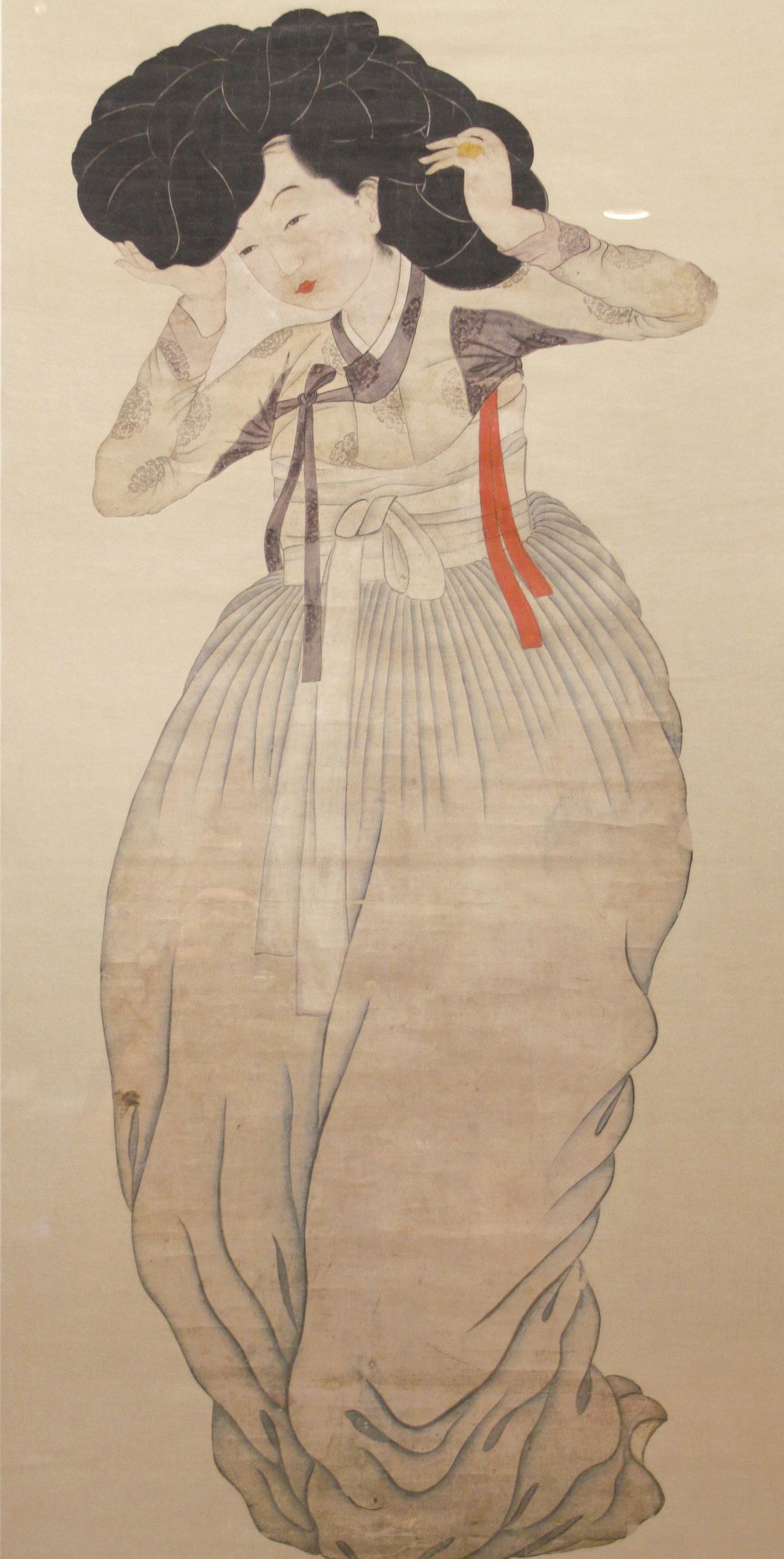 짧은 저고리에 풍성한 치마, 머리가 휘어질 정도로 무겁게 느껴지는 가발인 가채, 조선 후기 여인들의 미의식이다. 동그란 얼굴에 통통한 뺨과 앙증맞은 작은 입과 코, 쌍꺼풀이 없는 긴 눈은 우리나라 전통적인 미인상이다.