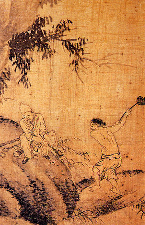 먼저 공재의 작품 석공을 볼까요. 한 사람은 정을 붙잡고 있고 한 사람은 망치를 막 내려치려 합니다. 정을 붙잡고 있는 사람의 표정이 관람자에게 긴장감을 줍니다. 혹 자신에게 돌이 튀지는 않을까. 내려치려는 망치가 자신의 손을 내려치지나 않을까 하는 긴장감이 그대로 묻어나 있는 표정입니다. 공재는 긴장감을 그 사람의 표정에, 약간 상체를 모로 틀고 있는 모습에 그대로 옮겨 담았습니다.