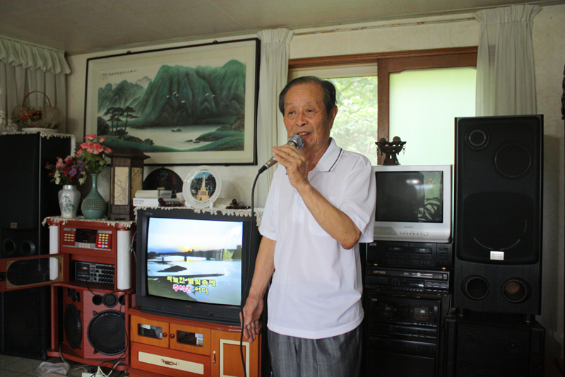 그의 거실로 들어서자 노래방기기와 최신 음향시설이 갖춰져 있다. 거실에 들어선 그는 자신의 애창곡인 ‘외나무다리’(최무룡 노래)를 고른다. 그의 목소리는 원로가수인 남인수의 목소리와 흡사한 미성인데, 노래를 부를 때는 아직도 젊은 시절의 목소리를 그대로 간직하고 있어, 귀로만 들으면 20대 목소리로 착각할 정도이다.