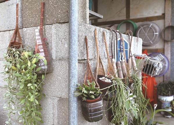그의 정원에는 요소요소 구경거리가 많다. 벽에 걸린 선인장, 화분마저 멋스럽고 호미와 채도 작품이다. 빽빽이 모아 놓은 장독대도 근사하다. 40여 개 장독대가 줄줄이 서 있는데