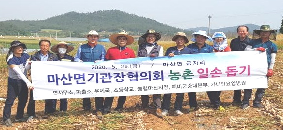 마산면기관장협의회(회장 박문재)는 지난달 29일 금자리에서 마늘캐기 봉사활동을 전개했다.