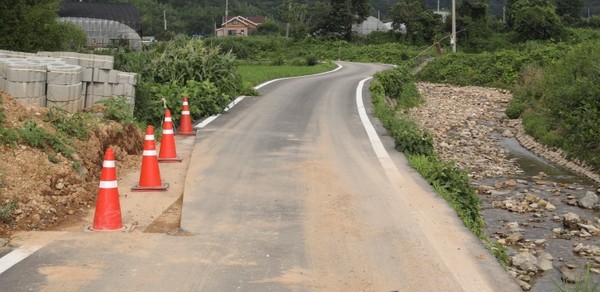 해남읍 신안리, 마을 안길에 아스콘이 절단돼 있어 차량이 위험하게 통과하고 있다. 도로 옆은 하천이어서 차량들은 아슬아슬하게 이곳을 통과한다. 마을주민과 토지소유주 가족 간의 분쟁으로 주민불편이 발생한 것이다.