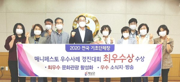 최우수상을 수상한 지역문화 활성화 분야 ‘미남해남(美南海南)의 기분좋은 변화’는 해남 농수산물과 먹거리를 주제로 한 해남미남축제 개최를 비롯해 365달마고도 워킹데이, 땅끝순례문학관 운영, 청년 기념품 협업 등이 우수사례로 높은 평가를 받았다.