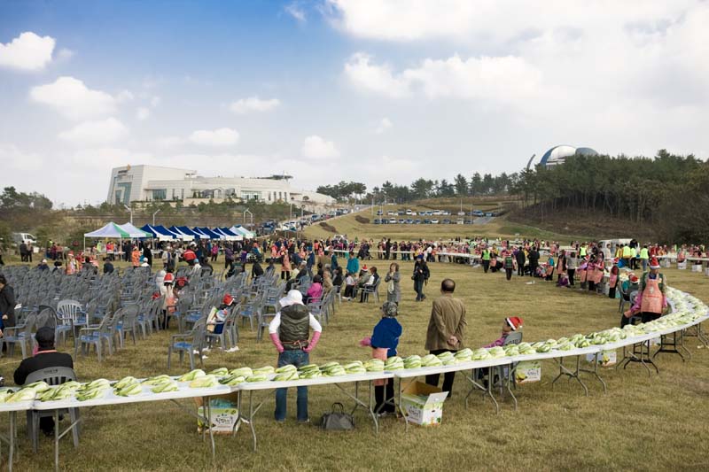 2011년 땅끝해남 김장축제 때 공룡형상을 한 1004m 한줄 연결하기가 한국 기록원이 인증한 기네스기록을 달성했다. 지난 12일 황산면 우항리 공룡화석지에서 열린 땅끝해남 김장축제에서는 공룡 형상을 한 해남절임배추 1004m 한 줄 연결하기와 함께 해남 5합 선포식이 함께 진행됐다. 한편 2010년 처음 열린 김장축제는 413m 길이를 연출해 한국기네스에 올랐고 포격사건으로 힘든 나날을 보내던 연평도 주민들에게 전달됐다. 박영자 기자/