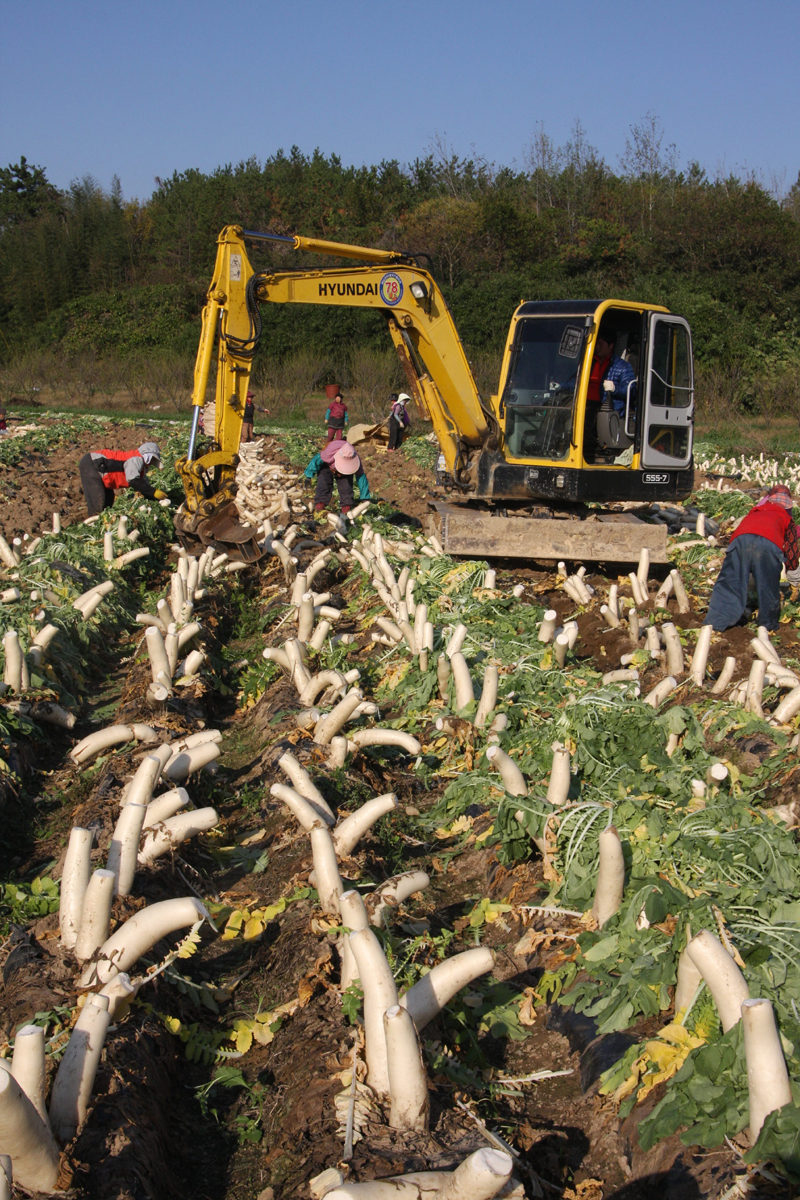 굴삭기로 무를 캐는 모습이 이채롭다. 마산면 신기마을 앞 무밭에서 굴삭기를 이용한 무 수확작업이 한창이다. 5~60cm 크기의 무가 땅속 깊이 박혀있어 사람의 힘으로는 도저히 캘 수 없단다. 밭주인은 무수확작업을 위해 비밀병기를 개발해냈다. 비밀병기는 삼지창을 장착한 굴삭기이다. 삼지창을 장착한 굴삭기가 두둑을 긁어주면 뒤따르는 아주머니들이 뽑아진 무를 주워 모으면 된다. 굴삭기 기사 장웅 씨는 굴삭기로 무 수확작업을 하는 것이 처음이라며 생소하지만 재미있고 작업능률도 좋다고 말했다. 박성기 기자/