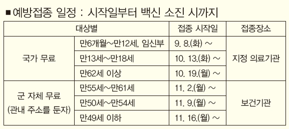 이에 따라 해남군은 국가무료접종 대상자를 우선 접종하고 자체 무료접종(19~61세) 대상자는 11월2일부터 백신 소진 시까지 연령별 순차 실시하기로 했다.