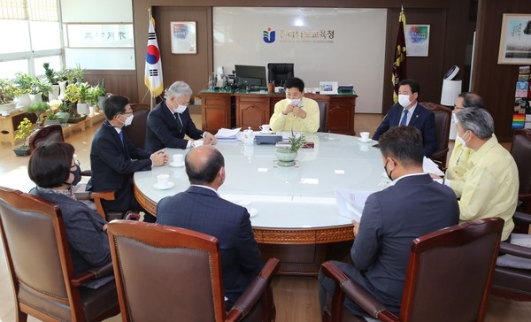 해남군의회 김병덕 의장은 지난 10월29일 축구부 합숙소 폐쇄 등 지역교육 현안과 관련 전남교육청 장석웅 교육감과 면담을 가졌다.
