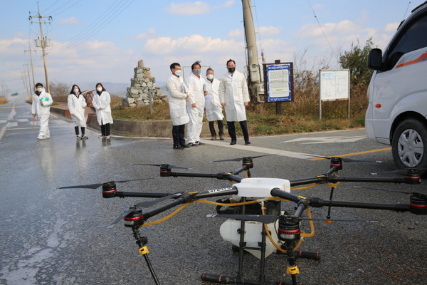 또 소독약품을 비롯해 생석회, 야생조류 기피제 등을 공급해 자체 방역에도 철저를 기하도록 하고 있다.