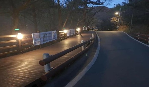 이에 따라 군은 금강골 산책로 구간 800m 보행등 20개소, 공설운동장 및 등산로 1봉 구간, 5개소에 대해 가로등 일제정비를 실시했다.