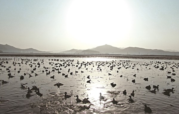 연방죽으로 유명한 현산면 신방저수지가 얼었다. 이중 저수지 가운데 해빙 공간이 가창오리와 청둥오리, 물닭, 큰고니 등 해남을 찾아온 모든 철새들의 월동장소가 됐다.