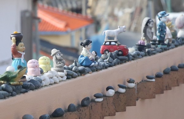 우수영문화마을의 가정집 담장. 물동이를 이고 있는 아낙부터 교복을 입은 여학생, 바다와 잘 어울리는 하루방, 자동차에 올라탄 하마 등 4m 남짓 담장에는 30여개의 조형물들이 늘어서 있다.