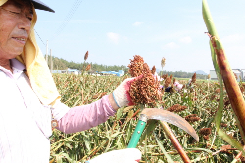해남 땅끝마을 가는 도로변의 밭두렁마다 노란 호박을 층층이 쌓은 ‘호박탑’이 가을정취를 물씬 풍긴다. 빨갛게 익어가는 수수도 가을을 재촉한다. 수수를 수확하고 있는 마산면 대상리 강인석(63)씨는 1000여평의 밭에 신품종인 밀양4호를 심었다. 일반 수수와 확연한 차이가 나자 많은 농민들이 종자를 부탁해 와 강 씨는 일을 못할 정도란다. 박성기 기자/