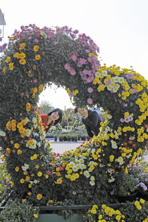 해남군민 광장이 국화꽃으로 물들었다. 제3회 국화대향연이 펼쳐지고 있는 군민광장에 군민들의 발걸음이 이어지고 있다. 국화꽃으로 만들어진 갖가지 조형물 앞에서 국화와 군민들은 하나가 된다. 박성기 기자/