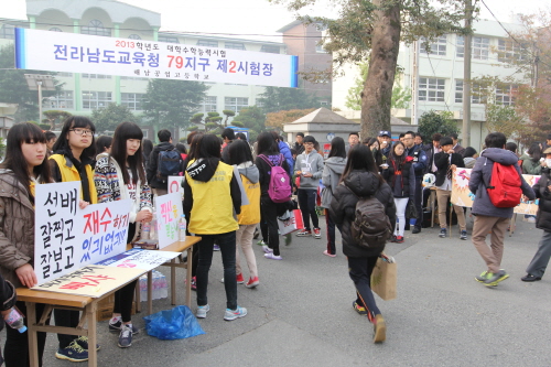 지난 8일 2013년 대학수능시험이 해남공고와 해남고 시험장에서 치러졌다. 수능시험당일 시험장 앞에선 각 학교 후배들과 사회단체 회원들이 따뜻한 음료와 선물을 전달하며 수험생들의 수능대박을 기원했다.