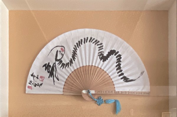 돌고래식당에 걸린 금산 스님의 달마도는 금색바탕 위에 그려져 있고 용 그림은 부채에 그려져 있다.