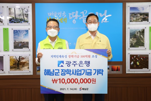 광주은행(은행장 송종욱)이 해남지역 청소년들의 교육을 위해 해남군 장학사업기금으로 1,000만원을 기탁했다.