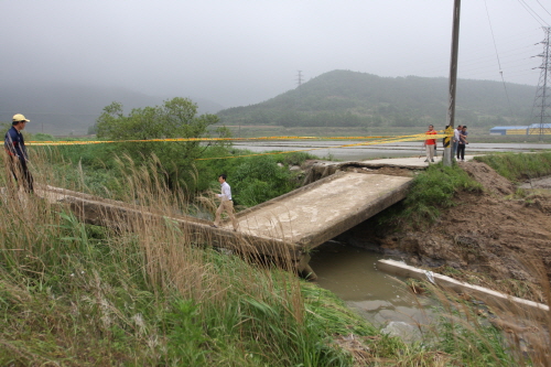 지난 20일 내린 집중호우로 삼산 계동리 앞 농로다리가 무너져 내렸다. 삼산 계동리 앞 교량은 30여년 전에 시설된 것으로 그동안에도 위험하다는 지적이 제기됐다. 무너진 교량 옆의 다리도 위험한 상황이어서 교체가 필요하다. 박영자 기자/