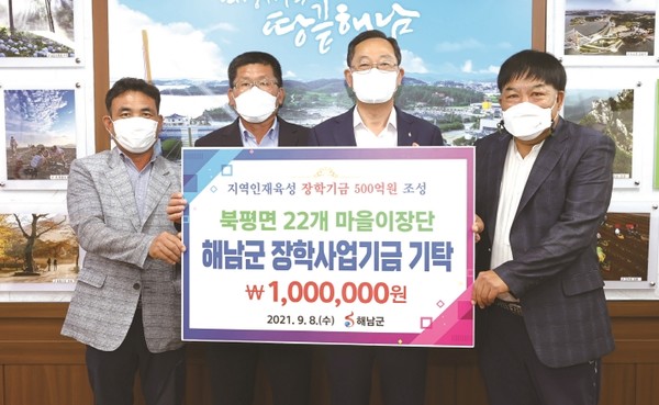 북평면 22개 마을이장단(단장 조정현)이 지역 청소년들의 교육을 위해 해남군 장학사업기금에 100만원을 기탁했다. 매년 이장수당 일부를 적립해 북평초와 중학교 학생들을 위한 장학금을 기탁하고 있는 북평면이장단은 올해 해남군이 교육의 백년대계를 준비하며 추진하고 있는 장학사업기금 500억원 조성 소식에 기탁을 결정했다.