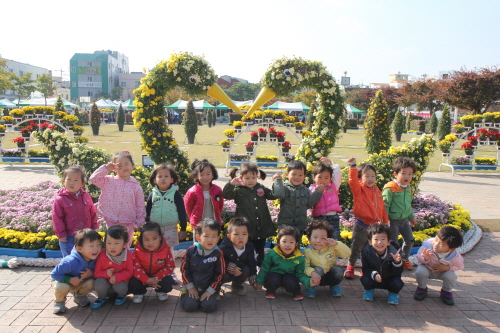 국화로 장식된 해남군민광장을 찾은 리틀어린이집 원생들이 카메라 앞에 섰던 지난달 30일. 국화도 어린이도 모두 청정하고 맑다. 제4회 국화향연은 오는 17일까지 이어진다. 윤현정 기자/