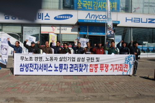 지난 13일 민주노총 해남군지부, 전국공무원노동조합 전남지역본부 등 22개 단체가 해남읍 고도리 삼성전자 앞에서 기자회견을 열어 삼성전자서비스의 불합리한 노동현실을 고발하고 지난달 31일 목숨을 끓은 천안센터 직원 최종범(32) 씨를 추모했다. 김유성 수습기자/