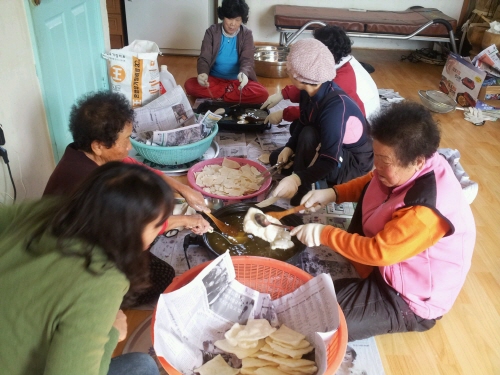 농촌건강장수마을인 송지면 방처마을 노인들과 부녀회원 30여명이 전통한과인 산자 만들기 체험에 나섰다. 지난 11일과 12일 마을회관에서 이뤄진 산자 만들기에서 주민들은 강사인 맛뜨락 윤영덕 사장의 지도에 네모난 산자를 정성스럽게 만들었다. 윤현정 기자/