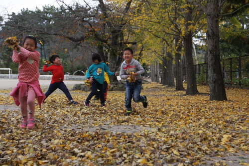 울창한 나무로 에워 쌓인 마산초등학교 운동장이 온통 낙엽으로 뒤덮였다. 마산초등학교 어린이들은 요즘 낙엽을 가지고 논다. 아이들에게 있어 낙엽은 또 다른 장난감인 셈이다. 김유성 수습기자/