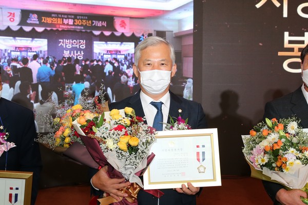 해남군의회 김병덕 의장이 지난 8일 담양에서 열린 지방의회 부활30주년 기념행사에서 지방의정 봉사상을 수상했다.