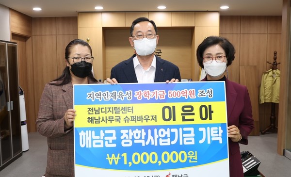 전남디지털센터 해남사무국(슈퍼바우저 이은아)이 해남지역 인재양성과 교육발전을 위한 해남군 장학사업기금에 100만원을 기탁했다.
