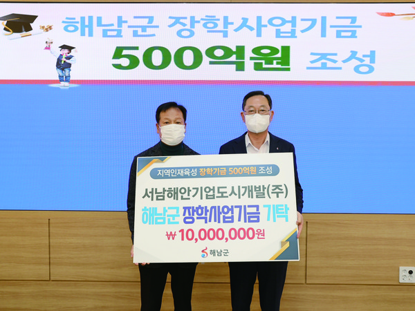 서남해안기업도시개발㈜(대표이사 채정섭)가 지역 인재양성을 위해 해남군 장학사업기금에 1,000만원을 기탁했다.