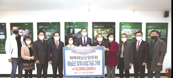 재목해남군향우회(회장 신지후)는 지난 12일 해남군에 장학사업기금 500만원을 기탁했다.