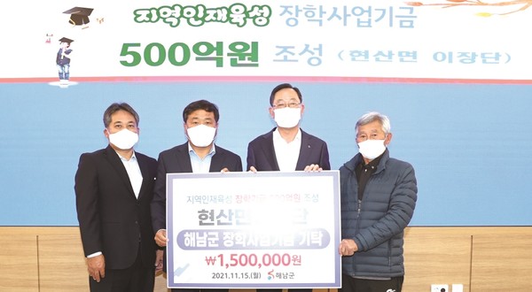 현산면 이장단(단장 추윤석)이 해남군 장학사업기금에 150만원을 기탁했다. 기탁식은 지난 15일 해남군청 군수실에서 열렸다.