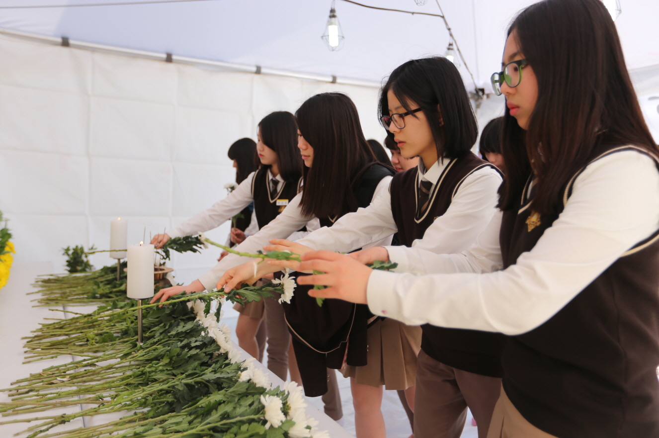 해남군민광장에 설치된 세월호 희생자 합동분향소에 군민들의 발길이 이어지고 있는 가운데 지난달 30일 해남고등학교 학생들도 분향소를 찾아 애도를 표했다. 해남군은 지난달 25일부터 합동분향소를 설치 운영하고 있다.