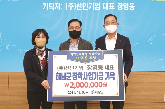 ㈜선인기업 장영동 대표가 지역 인재양성과 교육발전을 위한 해남군 장학사업기금에 200만원을 기탁했다.