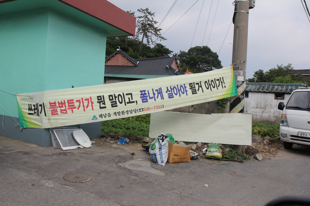 해남읍 구교리 회관 앞, 얼마나 쓰레기 불법투기가 심했으면 이런 편수막이 걸렸을까. 경상도 사투리로 표현된 글귀가 웃음 짓게 하지만 정말 쓰레기 불법투기 안 해야 되겠네요.김유성 기자/