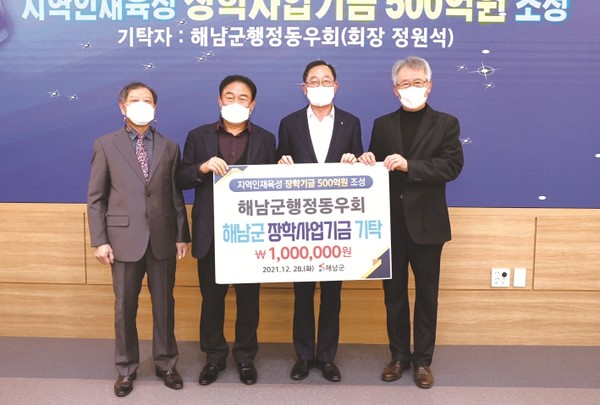 해남군행정동우회(회장 정원석)가 지역 우수인재 양성과 교육발전을 위해 해남군 장학사업기금에 100만원을 기탁했다.