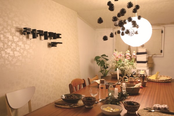 자연도 그에겐 훌륭한 오브제가 된다. 숲에서 모아온 솔방울, 솔가지로 다이닝룸을 꾸몄다. 커다란 식탁 위에서 저마다 존재를 뽐내고 있다.