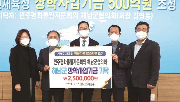 민주평화통일자문회의 해남군협의회(회장 김영동)가 지난 10일 해남군 장학사업기금에 250만원을 기탁했다.