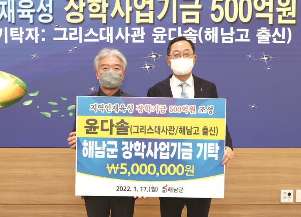 옥천면 백호리 윤다솔씨가 지난 17일 고등학교 및 대학교 재학 때 해남군으로부터 받은 장학금을 후배들에게 환원하고자 해남군 장학사업기금 500억원 조성에 동참했다. 윤다솔씨는 해남고 59회 졸업생으로 현재 그리스대사관에 외교관으로 근무 중이며 기탁식에는 아버지 윤채현 두륜중학교 교장이 대신했다.