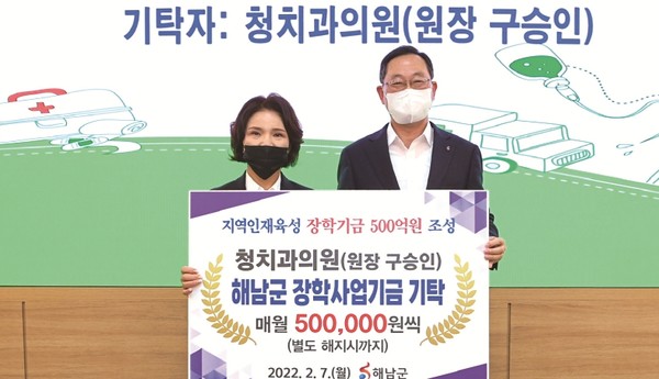 청치과의원(원장 구승인)에서 해남군 장학사업에 매월 50만원을 기탁키로 했다.