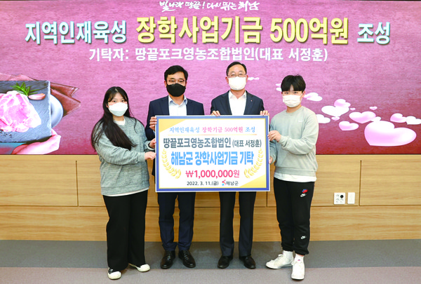 땅끝포크영농조합법인(대표 서정훈)에서 지역 인재양성과 교육발전을 위한 해남군 장학사업기금에 100만원을 기탁했다.